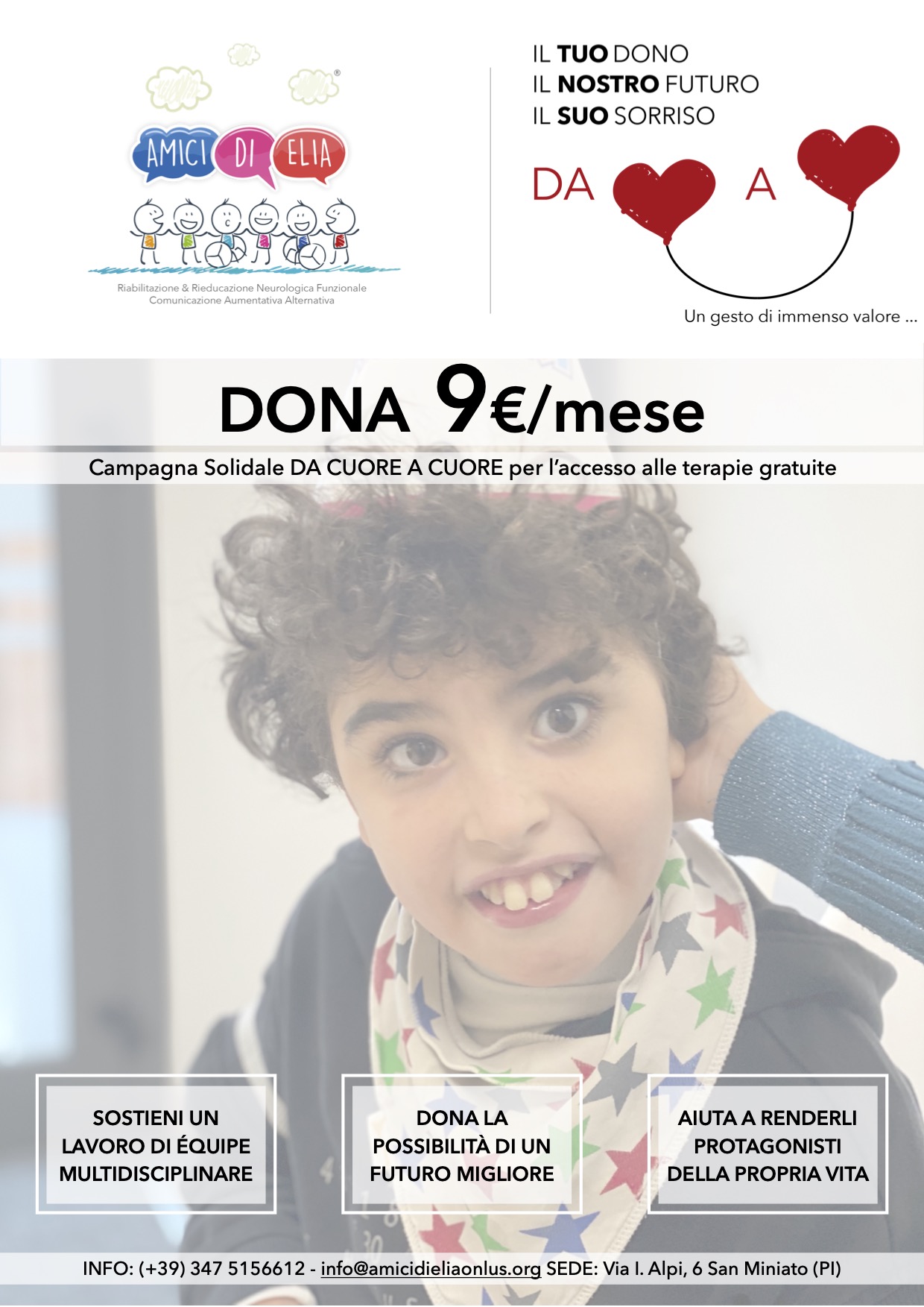 Con 9 euro al mese puoi diventare parte di qualcosa di grande, puoi trasformare un piccolo gesto in un grande aiuto, puoi fare in modo che la terapia non si fermi, che il sogno continui, che il futuro resti possibile, perchè è così che nasce la vera cura “DA CUORE A CUORE”.
